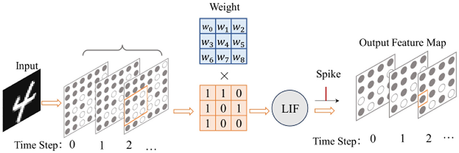 Like the convolutional layers in CNNs, the spiking convolutional layers in SNNs play a role in extracting input features spatially, but their input signals are a set of spiking sequences instead of continuous values. Assuming that the total number of timesteps in the network is T, the original image needs to be coded into spikes and then enters the spiking convolutional layer as T spiking images. Therefore, the convolution operation can be divided into convolving each of the T binary spiking images separately, and the result of each calculation is passed to the subsequent LIF neurons, as shown in Figure 2. The mathematical representation of spiking convolution is shown in Equation 3: