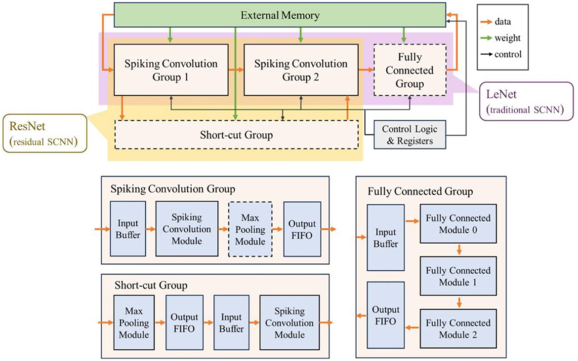 The overall architecture and dataflow of the accelerator is shown in Figure 3. The accelerator consists of a spiking convolution group, a fully connected group, a short-cut group, external memory, control logic and configuration registers. The parts indicated by dashed lines are optional modules depending on the different network structures. We configure the network based on the widely used LeNet structure and ResNet structure in current research to represent traditional convolution topologies and residual convolution topologies, and build the corresponding hardware accelerator. When configured as LeNet, the accelerator includes a fully connected group (as shown in the purple part of Figure 3); for ResNet structure, a short-cut group is introduced in the accelerator (as shown in the yellow part in Figure 3).