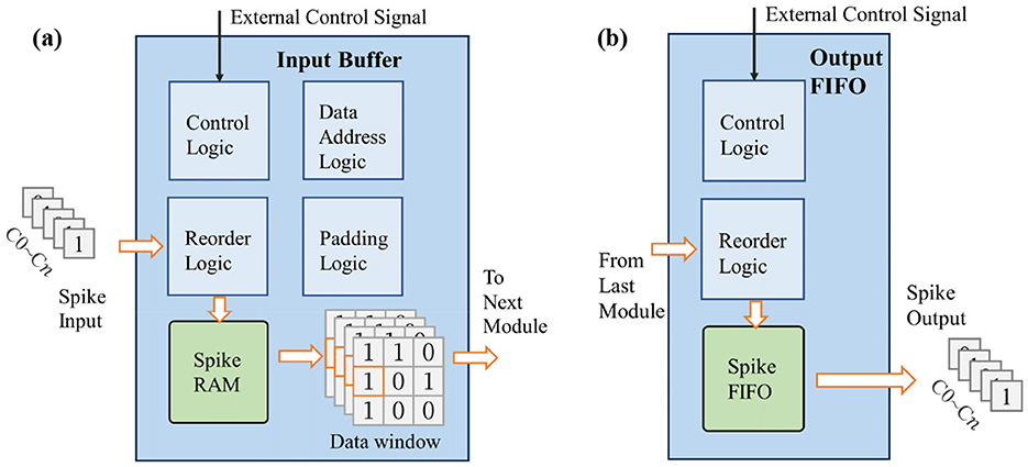 The input buffer module is mainly used to receive the input feature map data and reorder it into the sliding window required for convolution. Its design is shown in Figure 4a, where n represents the number of data channels. It includes spike RAM, a data window, control logic, as well as logic for address calculation, data reordering, and padding functions. The input buffer module receives data from the external memory or the previous stage's output FIFO. Due to the binary nature of the spikes, data can be transmitted preferentially according to the channel dimension. Therefore, the input feature map is traversed in the order of [C,X, Y, T] (where C denotes the input channel dimension, X denotes the width dimension, Y denotes the height dimension, and T denotes the timestep dimension) and stored in the spike RAM of the input buffer. When the stored data is sufficient to start subsequent calculations, the spike data is read out from the spike RAM and rearranged according to the configured network structure, and subsequently stored in the data window for next modules. When the subsequent module is a convolution or pooling module, the data window is configured as a two-dimensional register set with the same size as the computation kernel; when the subsequent module is a fully connected module, it is configured as a one-dimensional input spike queue; the padding operation is also completed during the data loading process within the input buffer module; the address calculation logic is used to generate the read and write addresses of the spike RAM. The control logic is used to receive configuration information, enable signals, and other signals transmitted by external control signals, and control other internal sub-modules to operate in the above-mentioned manner. All other modules also have similar control logic, which will not be repeated in the following content.