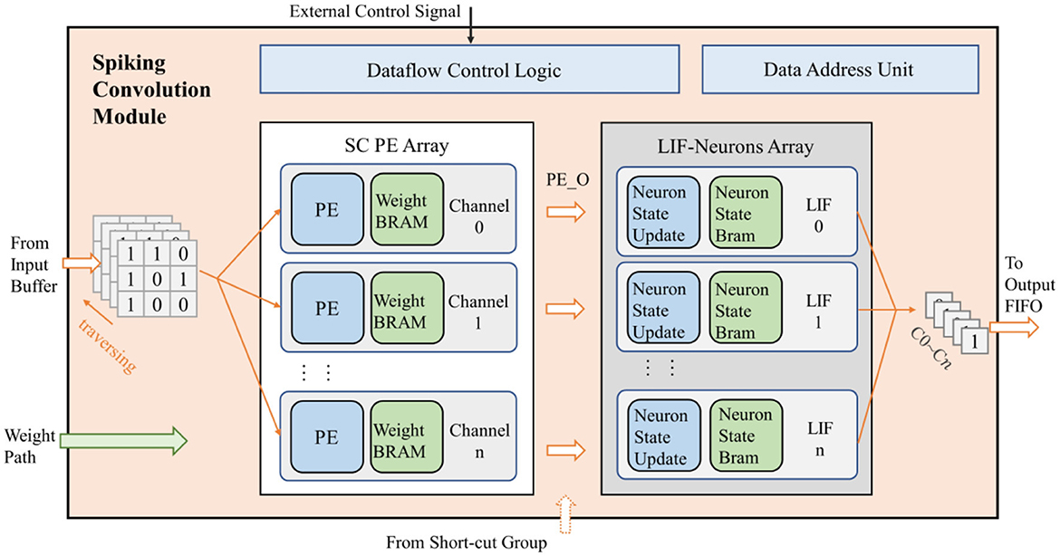 The spiking convolution module mainly includes a spiking convolution (SC) processing element (PE) array, an LIF neuron array, data flow control unit and data address calculation unit, as shown in Figure 5. Specifically, when configured as a residual structure, the spiking convolution module of the short-cut group does not include the LIF neuron array. The convolution module adopts a parallel structure according to the output channel to speed up the computation. It contains n independent computing threads (n is the number of output channels). Each computing thread consists of a convolution PE, an LIF neuron activator, a weight BRAM, and a neuron-state BRAM.