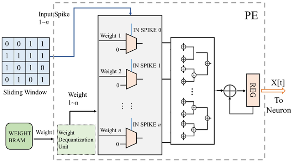 For the convolution operation in PE, since the input of SCNN's each layer is a binarized spiking image, the multiplicative accumulation operation of convolution can be transformed into the accumulation operation of weights. Therefore, multiplication operations are no longer required in the convolution process of SCNNs, which simplifies the circuit and greatly reduces the power consumption. The computational process is illustrated in Figure 6. The spiking convolution module reads the weights of the current layer from external memory and caches them in on-chip BRAM. The corresponding weights in the BRAM are read into the accumulator operand register based on the coordinates of the input data. The weights are represented as 8-bit fixed-point numbers or quantized to 8-bit integers (in this case, the read-out weights need to be converted to fixed-point form through a de-quantization unit). The values in the data window are used as the gating signals for the corresponding weight, to choose whether the operand entering the adder tree is the weight or 0. Subsequently, the adder tree calculates the accumulated result, which is stored in the accumulation result register until the final computation result PE_O is generated.