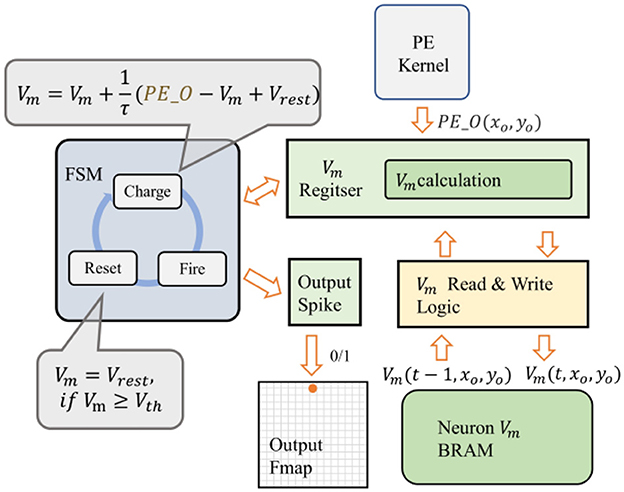 where τ is taken to the power of 2 so that a shift operation can be used instead of division. By using Equation 2, only shifters and adders are needed to calculate the potential of neurons.