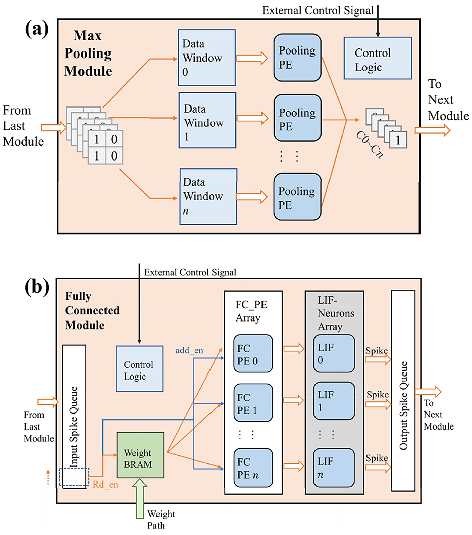 Figure 8b shows the architecture design of the fully connected (FC) module. It consists of an input spike queue, weight BRAM, a FC PE array, a LIF neuron array, an output spike queue, and control logic. Similar to the design of convolutional layers, a FC module containing n neurons can be considered as a convolutional layer with n output channels, but the output feature map's size of each output channel is only one. Therefore, in the FC module, the membrane potentials of neurons only need to be stored in their registers, and there is no need to store the membrane potential of different locations to the corresponding address of BRAM, as what we do in the convolution layer. For the input feature map, it is spread into a one-dimensional spike sequence stored in the input spike queue. The FC module sequentially reads the pixel values in the input buffer, and then takes them as the read enable of the weight BRAM and the gating signals of the accumulation operation for the PE on each output channel. Until all the pixels in the input buffer are read, each PE passes the cumulative value of the weight to the neuron array for activation to get the feature map stored in output spike queue under at the current time step. Although each pixel of the input feature map needs to be retrieved serially in order to obtain the output result of one timestep, the processing time of the fully connected module is still short due to the simple computational logic of FC module and the low data volume after two pooling's dimensionality reduction.