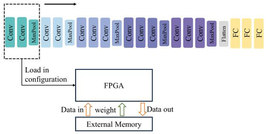 As the number of network layers increases, limited hardware resources may not be sufficient to implement the entire network. In such cases, only some layers of the network can be implemented in hardware, and the whole computation is completed layer by layer through reconfiguration and reuse strategies, as shown in Figure 10. This means that the computational modules in the hardware need to support specifications such as the number of channels and feature map sizes for each network layer. The specification information of the layer being accelerated currently is transmitted through the external interface, and then the corresponding computational resources in the accelerator are activated. The weights of the entire network need to be stored in external memory first, and only the weights of the layer being accelerated currently are read from DDR and stored in BRAM.