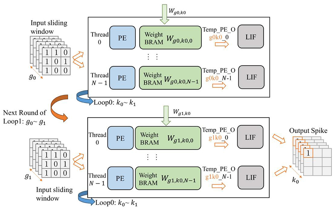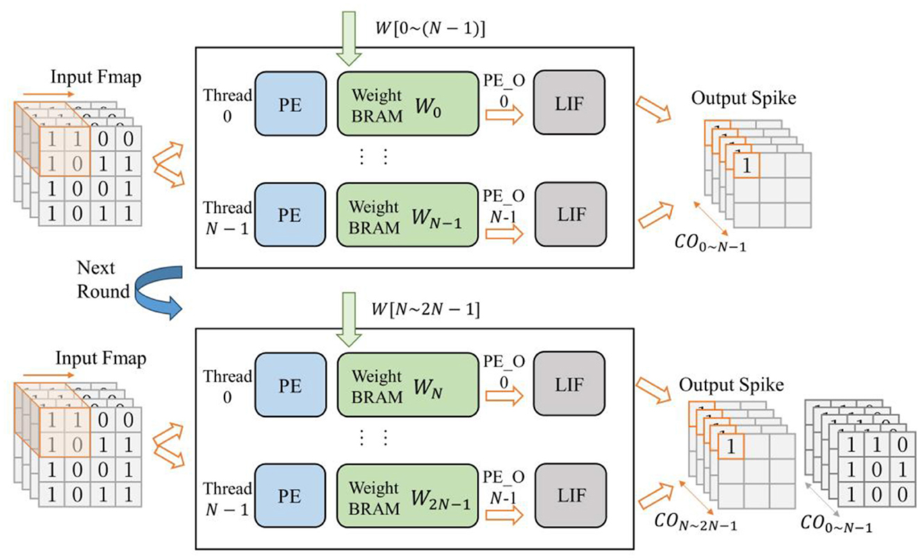 ![Diagram showing a neural processing flow with two main rounds. Each round contains input feature maps processed by multiple threads (Thread 0 to Thread N–1). Each thread includes a processing element (PE), weight BRAM (W), and LIF module, producing output spikes. The upper section processes weights W[0~(N–1)], while the lower section handles W[N~2N–1]. Output spikes generate 3D arrays labeled as (C0) to (C0{N–1}) and (C0{{N~2N–1}}). Additional arrows indicate data flow and transformations between components.](https://www.frontiersin.org/files/Articles/1662886/fnins-19-1662886-HTML-r1/image_m/fnins-19-1662886-g011.jpg)