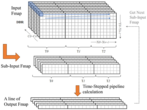 The core idea of this method is shown in Figure 13. First, the feature map in DDR is decomposed line by line into several sub-feature maps of K rows(K is the size of the convolutional kernel); the input buffer only needs to cache the data of one sub-feature map, eliminating the need to store the entire feature map. Then, following the timestep pipeline method designed in the previous context, the first line of the output feature map is calculated; subsequently, the remaining parts of the output feature map are calculated line by line in the same manner. Additionally, there are (K−S)(S is the stride of convolution) lines of overlapping data between every two sub-feature maps; the BRAM can reuse the repeated data through internal reordering logic during the data input process, so there is no need to load the overlapping data when loading a new sub-feature map. Each line of results is immediately output to the input buffer of the next layer, and once the pipeline of the next stage is filled, each line of input data can yield a new line of results.