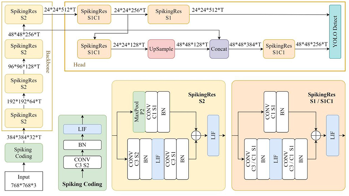 where x′ and y′ are the spatial position coordinate of the calculated output feature map element, x and y are the corresponding coordinate of the sliding window in the input feature map, kx and ky are the coordinate of the convolution kernel element, Ci and C0 are the input channel and output channel index of the convolutional layer, w is the convolution kernel weight, s is the input spike, and X is the result of the spiking convolution, which is also the input to the LIF neuron. Each element of the output feature map is calculated by the corresponding LIF neuron. The output feature map is also a binary spiking image, and is input to the next layer.