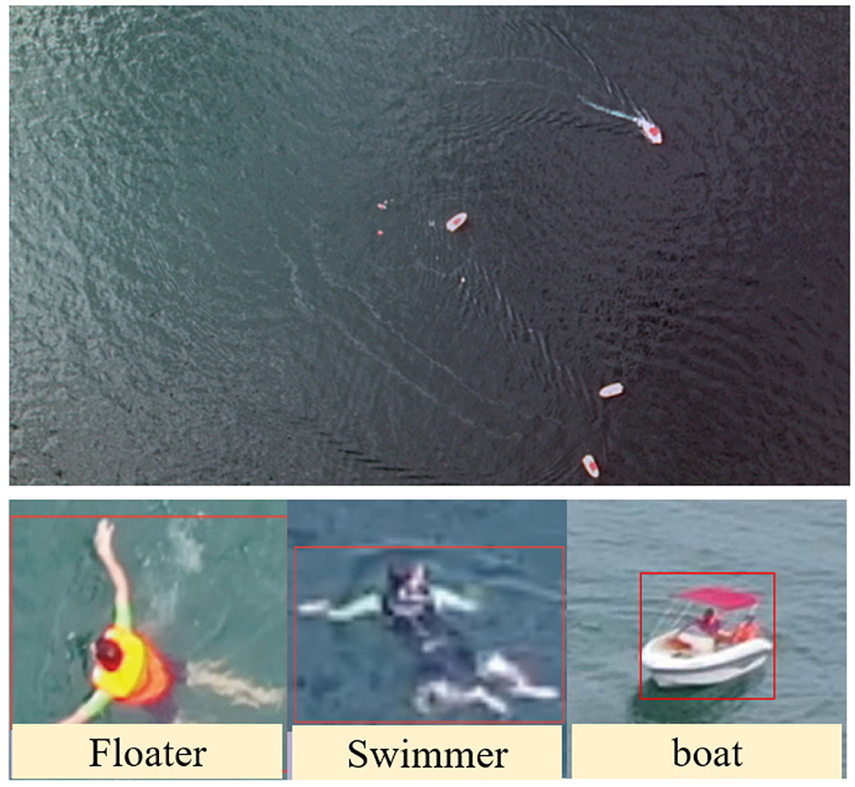 The dataset used was the SeaDronesSee dataset (Varga et al., 2022), which aims to study the use of drones in maritime scenarios for search and rescue operations. The dataset consists of 5, 630 high-resolution aerial images captured by drones (some examples are shown in Figure 15), with a training set of 2, 975 images, a validation set of 859 images, and a test set of 1, 796 images, suitable for tasks such as object detection. This scenario has strict requirements for the power consumption and volume of hardware, and there is an urgent need for low-power object detection. It is an ideal application scenario for object detection algorithms based on SNNs. Considering the practical rescue needs in real-world scenarios, we mainly focused on the three categories of targets in the experiments: “boats", “floaters wearing life jackets in the sea", and “swimmers in the sea without life jackets" (as shown in Figure 15).