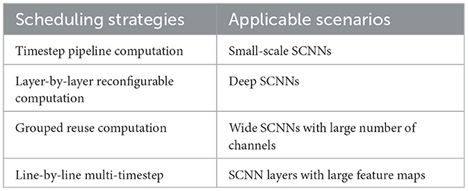 The paper is organized as follows. Section 2 introduces relevant background knowledge on spiking neural networks. The specific design of the SCNN hardware architecture is described in Section 3. Section 4 discusses the accelerator scheduling and configuration strategies for different-sized networks. Then, in Section 5, we evaluated the effectiveness of the proposed SCNN hardware architecture and scheduling configuration strategies based on traditional small networks and large residual networks. Finally, Section 6 summarizes our work.