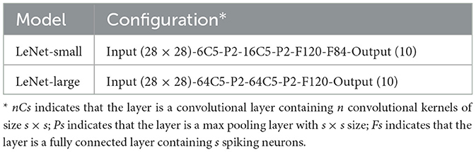 In this work, we take the LeNet model (Lecun et al., 1998) as the prototype and configure two different scale networks, defined as LeNet-Small and LeNet-Large. Their specific parameter configurations are shown in Table 2. We input the encoded 28 × 28-size spike images into the network according to the time step order. The 10 neurons in the output layer are used to represent the classification result. After processing the input of all the time steps, the category represented by the neuron, which has the highest cumulative number of output pulses in the output layer, is considered as the classification result.
