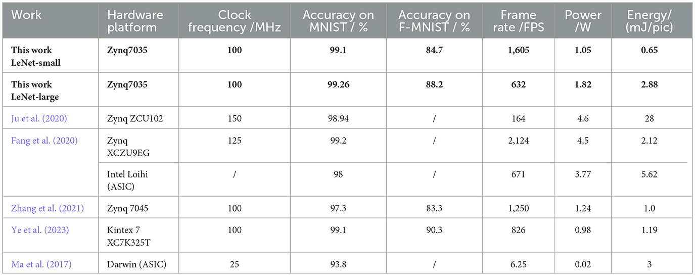 For the LeNet-Large model, its accuracy in the MNIST is improved to 99.26%, and the accuracy for Fashion-MNIST is significantly improved to 88.2%; although this is at the expense of part of recognition speed, its recognition speed still maintains 632 FPS, and the power consumption is only increased to 1.82 W. The energy consumption for single image processing in LeNet-Large is still better than that of works such as Ju et al. (2020) and Ma et al. (2017). Compared with other FPGA hardware and neuromorphic chips for SNNs/SCNNs, the SCNN hardware architecture proposed in this paper achieves competitive recognition rate and recognition speed as well as energy consumption performance.