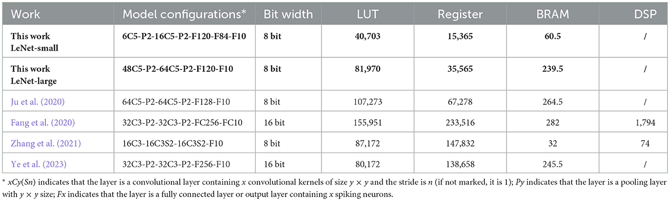 Table 4 summarizes the FPGA resource consumptions of the proposed SCNN accelerator architecture in this paper and compares it with other recent work on SNN/SCNN accelerators. It can be seen that the architecture proposed in this paper has excellent performance, while its hardware resource consumption is significantly better than other FPGA implementation schemes. Even for the larger network, LeNet-Large, our resource consumption such as registers still has a significant advantage over those with similar quantization bit width and network size, such as the work of Ju et al. (2020). In particular, our hardware design does not need to use the DSP resources in FPGA as other high-speed solutions like Zhang et al. (2021) and Fang et al. (2020) do. The proposed SCNN hardware design facilitates the deployment of SCNNs in low-cost FPGA and provides more space for integrating other applications.