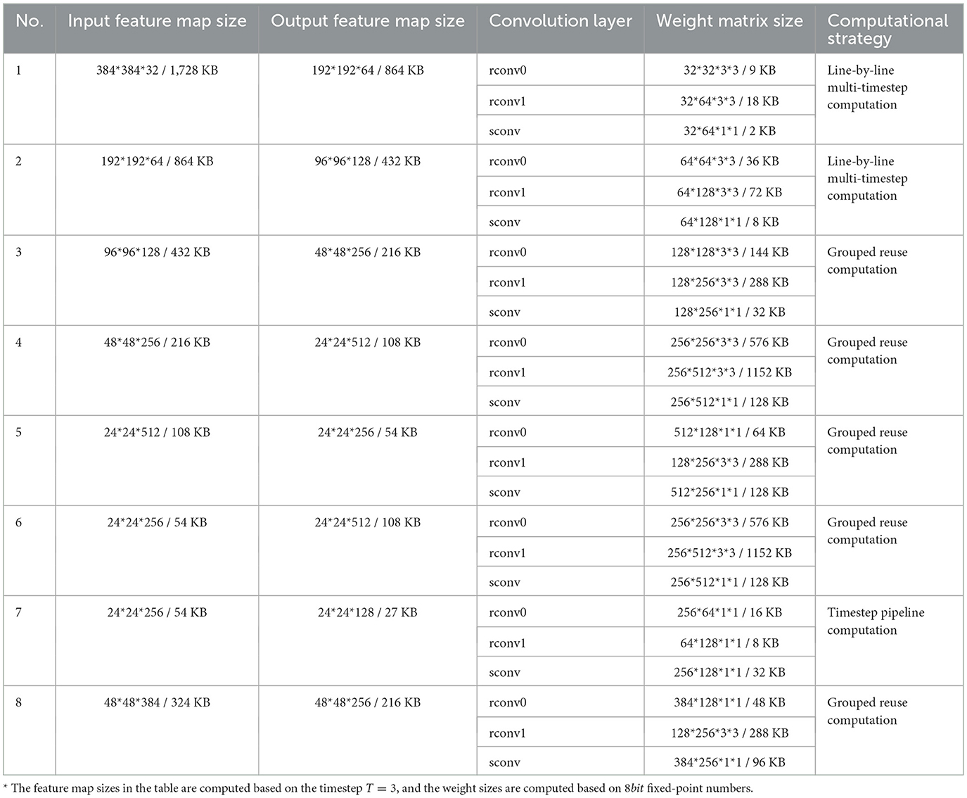 Artificial neural networks (ANNs) have achieved revolutionary applications in numerous fields, but their structure and capabilities still have a significant gap compared to real biological neural networks, especially in terms of the high energy consumption required during their computational processes (Javanshir et al., 2022). Compared to traditional ANNs, spiking neural networks (SNNs) have a higher degree of biomimicry to the human brain. SNNs express information through spike sequences. This enables SNNs to process information in both temporal and spatial domains, and to achieve a closer fit to neural dynamics models (Deng et al., 2020; Taherkhani et al., 2020). Due to the lack of effective learning algorithms, in its early development, SNNs had poor performance in multi-layer network structures, and related researches were also limited to shallow networks with multilayer perceptron (MLP) topological structures. However, the development and prosperity of deep neural networks in the past decade have had a significant impact on SNN research. Many structures, learning algorithms and ideas of ANNs have been successively introduced into SNNs. Among them, SNNs including convolution structure, namely, spiking convolutional neural networks (SCNNs), as well as learning algorithms such as ANN conversion method and backpropagation method, have gradually become the hotspots in the current research of SNNs. SCNNs are widely recognized to be able to achieve deeper network layers with higher performance like convolutional neural networks (CNNs). Sengupta et al. (2019) successfully trained the SCNNs of VGG architecture and even ResNet architecture through the method of ANN conversion to SNN. Spatio-temporal backpropagation (STBP) is a back-propagation algorithm effectively applied to multi-layer SCNN direct training (Wu et al., 2018, 2019); based on the STBP method (Zheng et al., 2021), threshold-dependent batch normalization (tdBN) is proposed to implement direct training of ResNet-scale SCNNs. In general, the current SCNNs are gradually approaching the existing deep ANNs in terms of network layers and scale. And the network performance and application potential of SCNNs in real-world scenarios have been significantly improved. However, this also means that more and more computing resources are needed for SCNNs, and the demand for efficiently running SCNNs is also increasing.