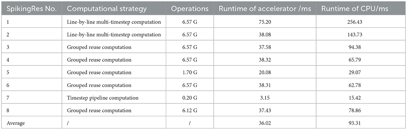 The effects of our accelerator on each SpikingRes block are shown in Table 6. It can be seen that for most of the SpikingRes blocks, the amount of operations is similar despite their different specifications. The running time of the accelerator for these different SpikingRes blocks almost corresponds to their operations amount. This indicates that the computational resources of the accelerator are fully utilized under these proposed computational strategies. The running time of each SpikingRes block is faster than that of the CPU, except for the first SpikingRes block, which takes longer than the other SpikingRes blocks due to the large image size and the small number of channels, which makes part of the computational resources unutilized.