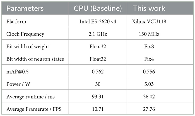 And the overall comparison results of performance and power consumption between the accelerator and CPU platform are shown in Table 7. It can be seen that the average inference delay of the accelerator is 36.02 ms, i.e., the average framerate of each SpikingRes block is 27.76 FPS, which is 2.59 times that of the CPU platform. The measured power consumption of the CPU is 30 W; while the power consumption of the accelerator is 5.03 W, which is only 16.77% of that of the CPU. In terms of accuracy, the error of the hardware accelerator designed in this paper mainly comes from the fixed-point quantization of weights and neuron states. As can be seen from Table 7, under the condition of simulating by converting weights into 8-bit fixed-point numbers and neuron states into 4-bit fixed-point numbers, the network's accuracy loss is less than 0.01, which is still within an acceptable range.