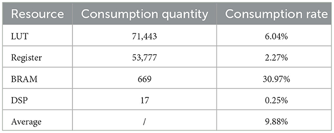 The hardware resources consumed by the accelerator when mapped to the FPGA are shown in Table 8. The accelerator only uses 9.88% of the FPGA's hardware resources. The DSPs are only used in the calculation of BRAM addresses in the input buffer, and are not used in the process of spiking convolution, significantly reducing the demand for DSP resources.