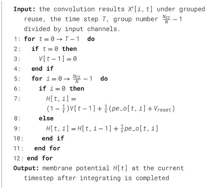 From the above equation, we can see that the intermediate calculation result Temp_PE_Of,gi from PE cannot be directly used for the activation result of LIF neuron. It needs to be temporarily stored until the calculation result for the last group of input feature maps is generated. To achieve this, we utilize the accumulation relationship in Equation 4 and accumulate the intermediate calculation results into the membrane potential value of the neuron. Therefore, under the grouped reuse computation method for wide SCNNs, the integrating equation for the LIF neuron described in Equation 2 needs to be modified as shown in Algorithm 1.