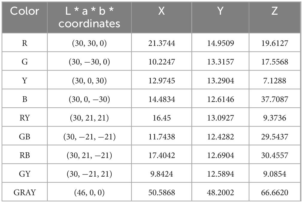 We selected eight colors from the CIELAB color space with a phase difference of 45° and grouped them into four rivalry color pairs as the Color stimuli (Figure 3): Red-Green (R-G), Yellow-Blue (Y-B), Orange-Cyan (RY-GB), and Purple-Yellow Green (RB-GY). All color pairs had an L* value set to 30, and brightness was controlled at 15 ± 0.5 cd/m2 (Xiong et al., 2021). Based on the monitor’s color characterization, we measured the XYZ chromaticity values of the selected colors, the coordinates of each color in the CIELAB color space and their corresponding XYZ chromaticity values are listed in Table 1.