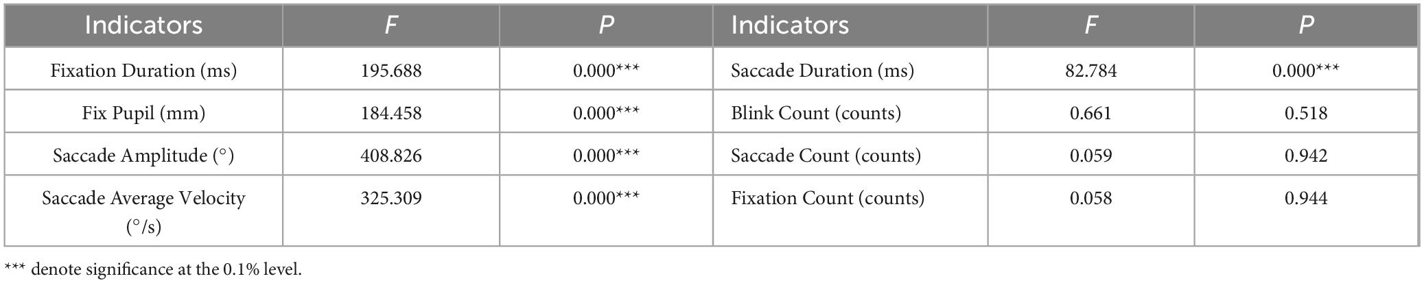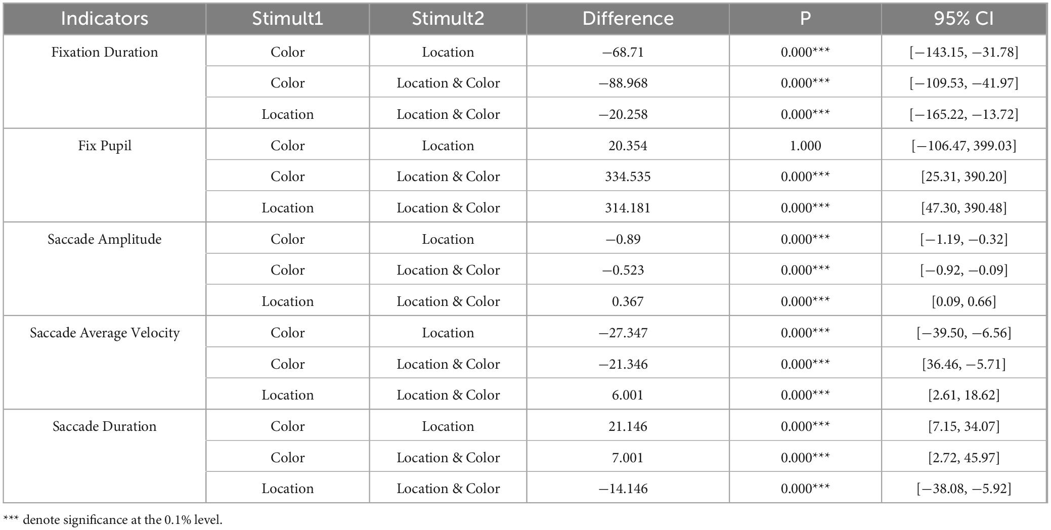 This study systematically examined the effects of three visual stimuli (Color, Location, and Color & Location) on eye movement behavior using a one-way ANOVA followed by Bonferroni-corrected post-hoc tests. As shown in Table 2, significant main effects were observed for Fixation Duration (F = 195.688, p < 0.001, partial η2 = 0.062), Fix Pupil (F = 184.458, p < 0.001, partial η2 = 0.029), Saccade Amplitude (F = 408.826, p < 0.001, partial η2 = 0.129), Saccade Average Velocity (F = 325.309, p < 0.001, partial η2 = 0.021), and Saccade Duration (F = 82.784, p < 0.001, partial η2 = 0.128). However, no significant differences were found in basic eye movement metrics including Blink Count (p = 0.518), Saccade Count (p = 0.942), and Fixation Count (p = 0.944) across the three conditions (p > 0.05). The results of the Bonferroni-corrected pairwise comparisons revealed significant differences among all stimuli conditions for Fixation Duration, Fix Pupil, Saccade Amplitude, Saccade Average Velocity, and Saccade Duration (Table 3). Notably, no significant difference was observed between the Location and Color stimuli in terms of Fix Pupil.