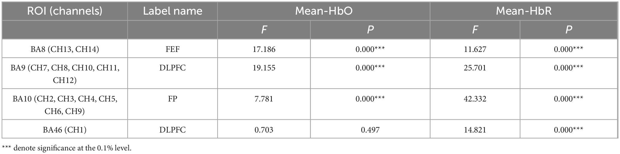 Table 4 presents the results of a one-way ANOVA, examining changes in HbO and HbR concentrations in PFC regions during the execution of three different stimuli tasks. The results indicate that HbO and HbR values in the BA8, BA9, and BA10 regions showed statistically significant differences across conditions. In contrast, only HbR values in the BA46 region demonstrated significant statistical differences among the stimuli conditions.