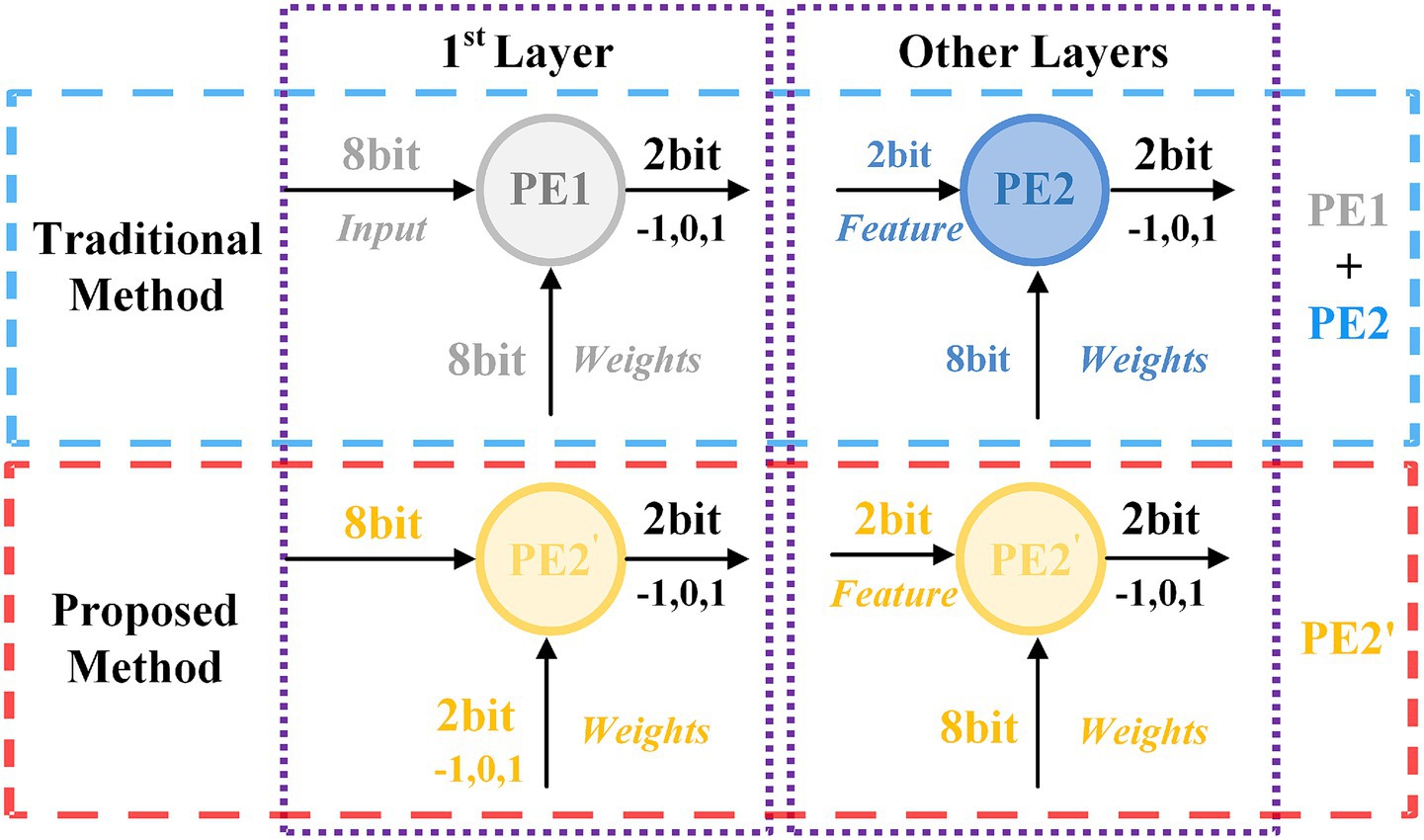 Since the hidden layer’s feature map uses 2-bit ternary values {−1, 0, 1}, convolution multiplications simplify to additions. The first-layer weights are reduced to 2 bits via ternary quantization. This approach retains the input image at 8-bit precision but enables computing unit reuse through configurable operations.