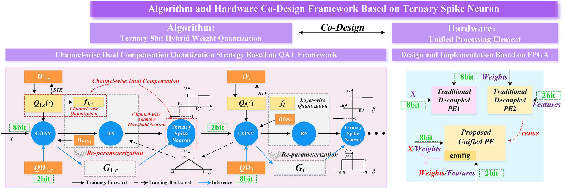 The deployment of Spiking Neural Networks (SNNs) on resource-constrained edge devices is hindered by a critical algorithm-hardware mismatch: a fundamental trade-off between the accuracy degradation caused by aggressive quantization and the resource redundancy stemming from traditional decoupled hardware designs. To bridge this gap, we present a novel algorithm-hardware co-design framework centered on a Ternary-8-bit Hybrid Weight Quantization (T8HWQ) scheme. Our approach recasts SNN computation into a unified “8-bit × 2-bit” paradigm by quantizing first-layer weights to 2 bits and subsequent layers to 8 bits. This standardization directly enables the design of a unified PE architecture, eliminating the resource redundancy inherent in decoupled designs. To mitigate the accuracy degradation caused by aggressive first-layer quantization, we first propose a channel-wise dual compensation strategy. This method synergizes channel-wise quantization optimization with adaptive threshold neurons, leveraging reparameterization techniques to restore model accuracy without incurring additional inference overhead. Building upon T8HWQ, we propose a novel unified computing architecture that overcomes the inefficiencies of traditional decoupled designs by efficiently multiplexing processing arrays. Experimental results support our approach: On CIFAR-100, our method achieves near-lossless accuracy (<0.7% degradation vs. full precision) with a single time step, matching state-of-the-art low-bit SNNs. At the hardware level, implementation results on the Xilinx Virtex 7 platform demonstrate that our unified computing unit conserves 20.2% of lookup table (LUT) resources compared to traditional decoupled architectures. This work delivers a 6 × throughput improvement over state-of-the-art SNN accelerators—with comparable resource utilization and lower power consumption. Our integrated solution thus advances the practical implementation of high-performance, low-latency SNNs on resource-constrained edge devices.