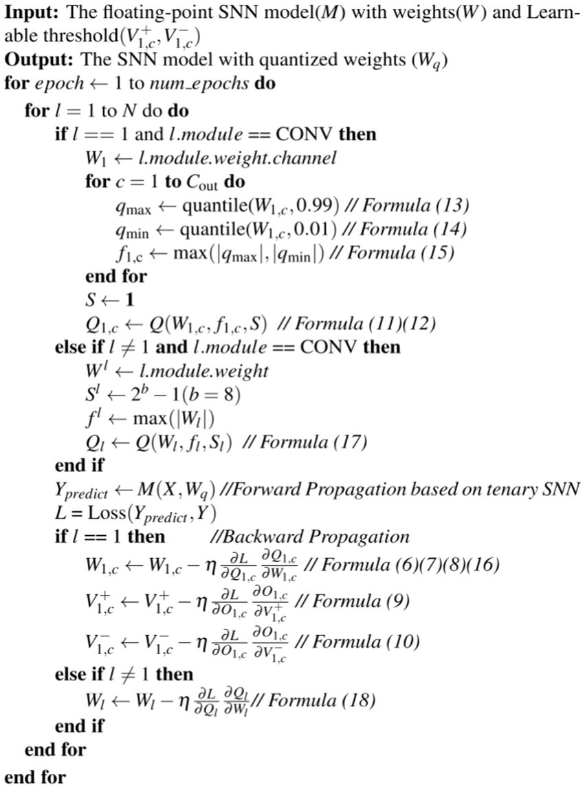 During training, we employ a cross-entropy loss function with stochastic gradient descent optimization which incorporates weight decay (0.0005) and momentum (0.9) parameters. The full precision SNNs are trained for 300 epochs on the all datasets. The learning rate is 0.1 for VGG architectures and 0.01 for ResNet network, with a batch size of 256. We adopt a cosine learning rate decay schedule during training. During quantization stage, the AdamW optimizer is used with a weight decay of 0.01. The leaky factor 𝜏 is fixed at 1 and the firing threshold 𝜃 for ternary spike neurons is initialized at 0.5. The time step is set to 1 for all experiments. We utilize Python 3.10 and PyTorch 1.12 software and two NVIDIA A6000 Graphical Processing Units (GPUs). The operating system is Ubuntu 18.04.