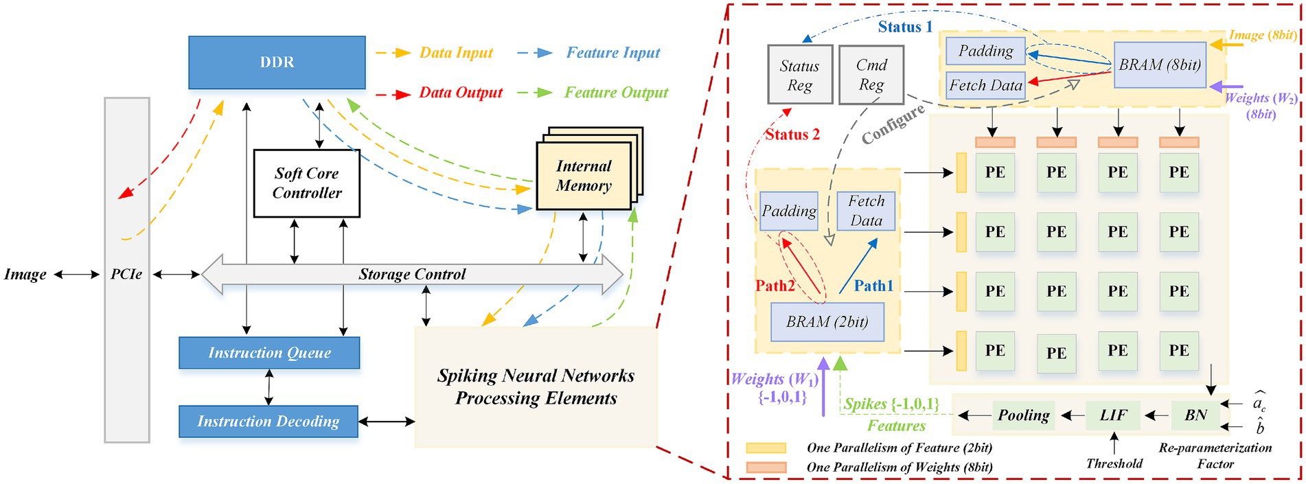Storage Control: This is a scheduling module that manages the transfer of data between the DDR, BRAM, and SNN processing cores. Through Direct Memory Access (DMA) operations, it ensures timely data delivery to the PE array according to execution requirements.