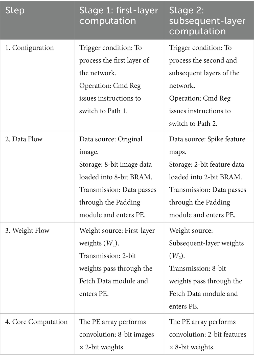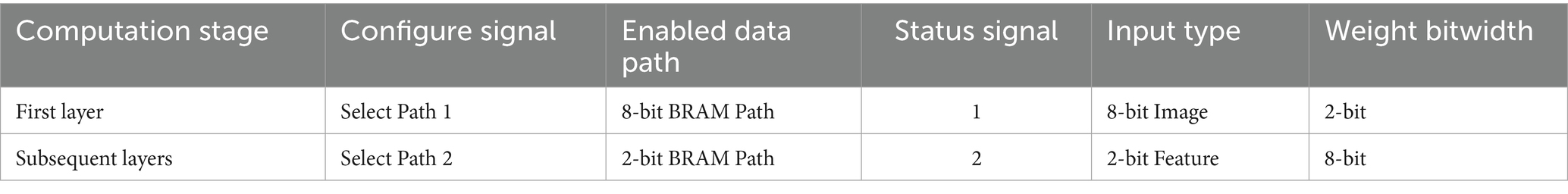 Configuration and state control: It consists of command registers (Cmd Reg) and status registers (Status Reg). The Cmd Reg receives configuration instructions from the instruction decoder. The Configure signal determines which data path (8-bit BRAM path or 2-bit BRAM path) to enable based on whether the first or subsequent layer is currently being calculated, and directs the corresponding data to the PE array. The Status Reg collects status signals (Status 1/2) from the data path, such as data readiness, computation completion. These statuses are fed back to the soft core controller. This configuration logic is summarized in Table 2 and the overall workflow utilizing these configurations is detailed in Table 3.