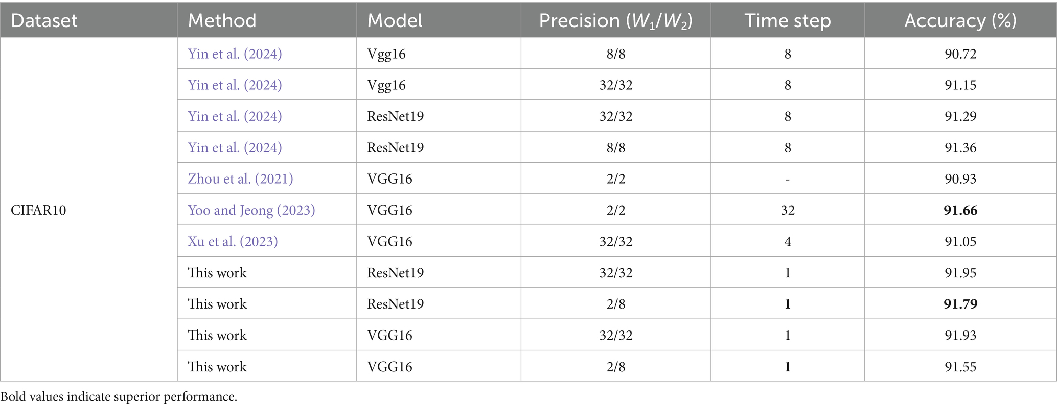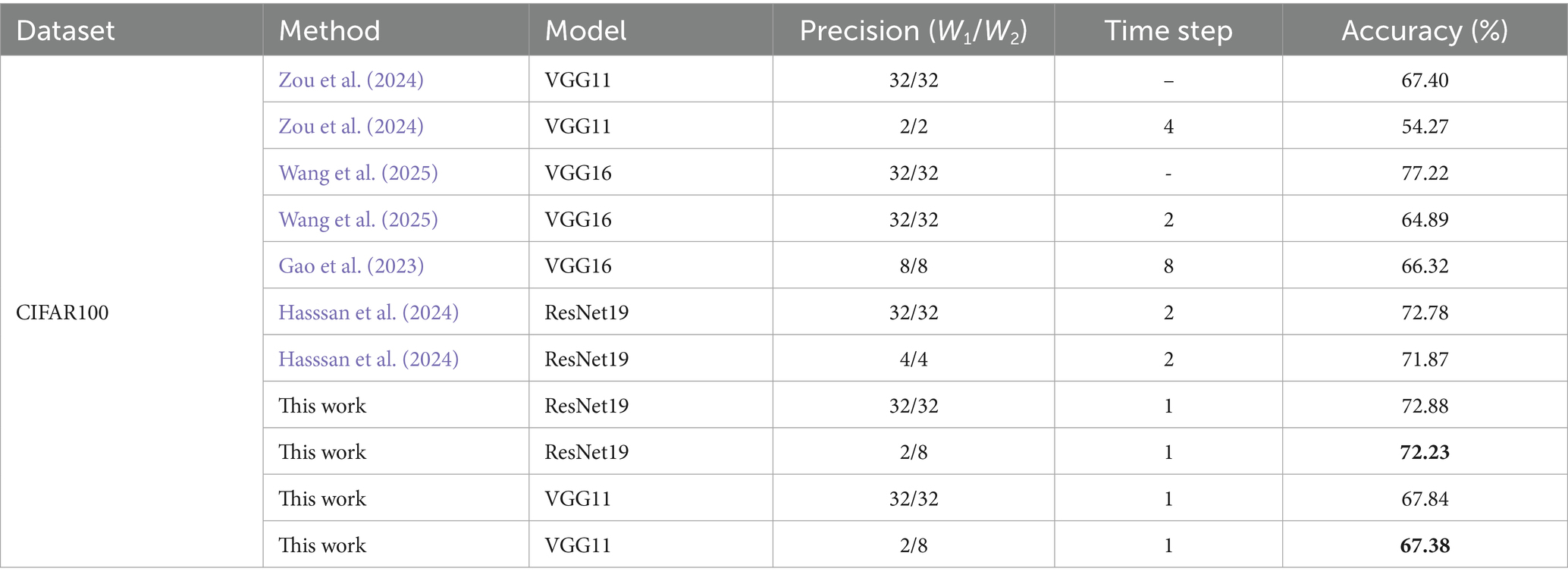 4. We evaluate our proposed method through both algorithm and hardware experiments. Algorithmically, on the CIFAR-10 and CIFAR-100 datasets, our approach attain near-lossless accuracy (<0.7% degradation) relative to the full-precision model in a single time step, performing competitively with other state-of-the-art (SOTA) low-bit SNNs. On the hardware front, implementation on a Xilinx XC7VX690T platform confirm that the unified computing architecture reduces lookup table (LUT) resource utilization by 20.2% compared to the traditional architecture. Compared with other advanced SNN hardware accelerators, our design delivers 6 × greater throughput than advanced SNN hardware accelerators at a comparable resource and power budget.