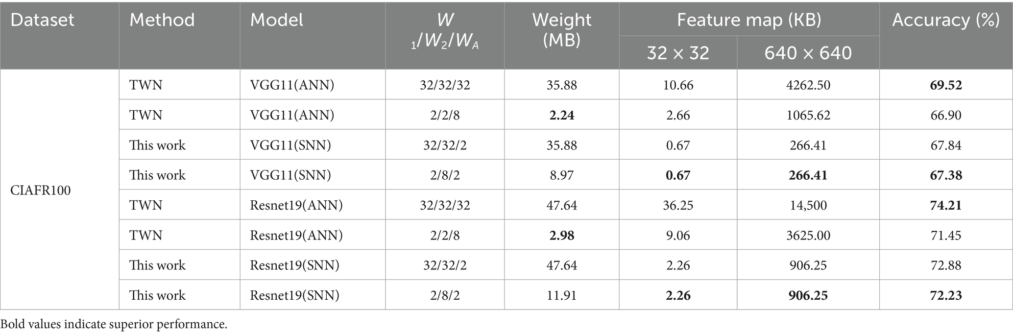Firstly, regarding classification accuracy, the proposed method achieves 67.38%, surpassing all comparison works. This outcome indicates that the T8HWQ scheme and the network architecture can be effectively deployed while maintaining high accuracy. Importantly, this level of performance is achieved at a single time step, without introducing any additional latency. Therefore, our method offers the dual benefits of low latency and high performance.