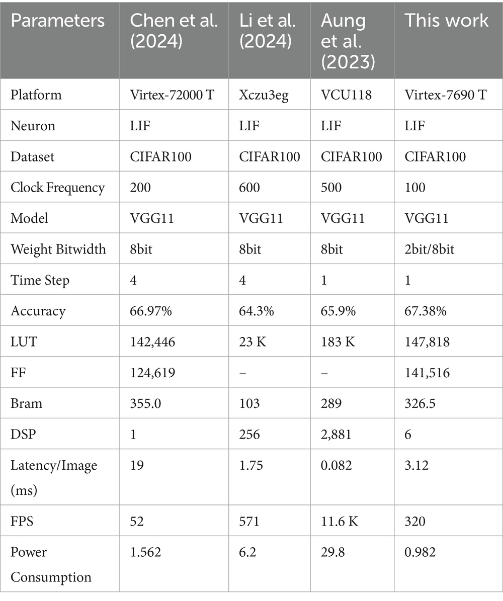 Regarding throughput, while the methods presented in Li et al. (2024) and Aung et al. (2023) achieve lower latency with higher clock frequencies (600 MHz and 500 MHz), these performance gains come at the cost of substantial power consumption and DSP resource utilization. In comparison, our design achieves an image processing delay of 3.12 ms and a throughput rate of 320 FPS at a clock frequency of only 100 MHz. The processing latency of our proposed method is approximately six times lower than that of Chen et al. (2024), despite the latter’s implementation being deployed for four time steps, which is four times that of our design. This indicates that our method possesses a highly competitive high-throughput characteristic.