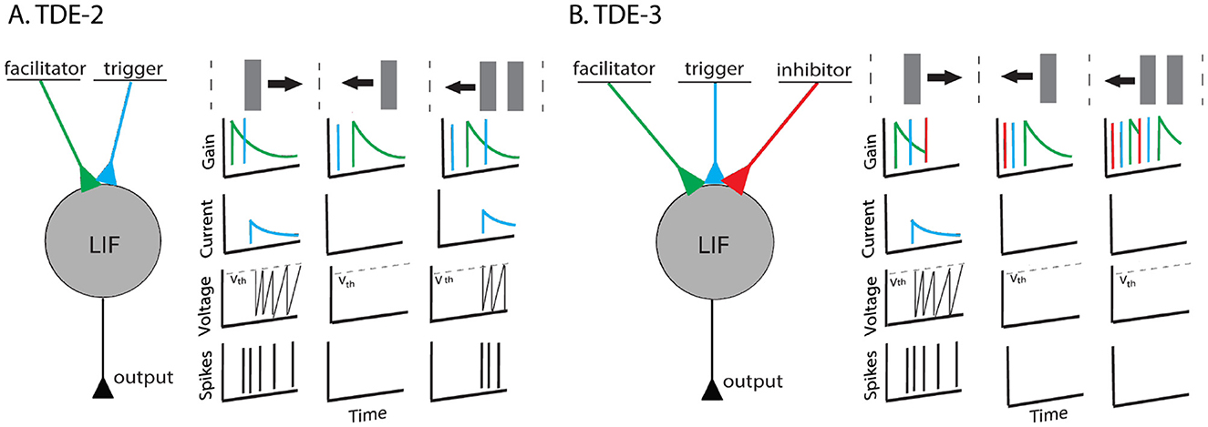 Figure 1. TDE-2 and TDE-3. (A) Left-to-right tuned 2-point TDE. It has two compartments: the facilitator and the trigger. When a stimulus moves to the right the trigger is activated after the facilitator and the neuron fires. However, in the gain, there is residual activity. Thus, when multiple textures move left (or orthogonally) the detector loses direction-selectivity (B). Left-to-right tuned 3-point TDE. It has three compartments. Input to the inhibitor resets the gain to zero and removes residual activity. Therefore, direction-selectivity is retained.