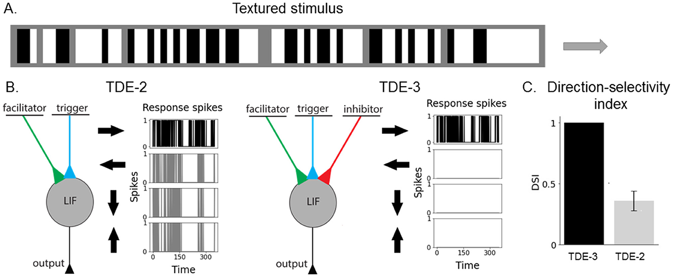Figure 2. Augmented 3-point TDE retains direction-selectivity in a textured environment. (A) Visual stimulus composed of vertical bars. The bars had three light intensity levels: white, gray, and black. The size of the texture along the motion axis was 80 pixels and 3 pixels along the orthogonal direction. We employed 5 velocities: 0.1 px/timestep, 0.2 px/timestep, 0.33 px/timestep, 0.5 px/timestep and 1 px/timestep. The motion direction (left-right, right-left, top-bottom, bottom-top) and velocity were randomly chosen for each stimulus example (2,000 examples per testing round, 400 testing rounds). To vary the “amount” of texture in stimuli we randomly varied the fraction of the gray bars from 0% to 80%. (B) TDE-2 and TDE-3 and their responses to stimuli moving in 4 cardinal directions. (C) Direction-selectivity index (fraction of spikes fired upon stimulus motion in PD).