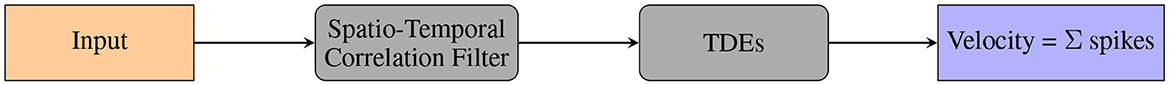Yet, a quick inspection of the column “Total N spikes” in Tables 3–5 shows that TDE-2-based circuitry always spiked more than TDE-3-based circuitry. The reason for this is that although subtraction of velocity estimates made by opposingly tuned detectors mitigates the loss of direction-selectivity of TDE-2 in a textured real-world environment, the inhibitory input to TDE-3 eliminates residual activity immediately at the level of motion detection.