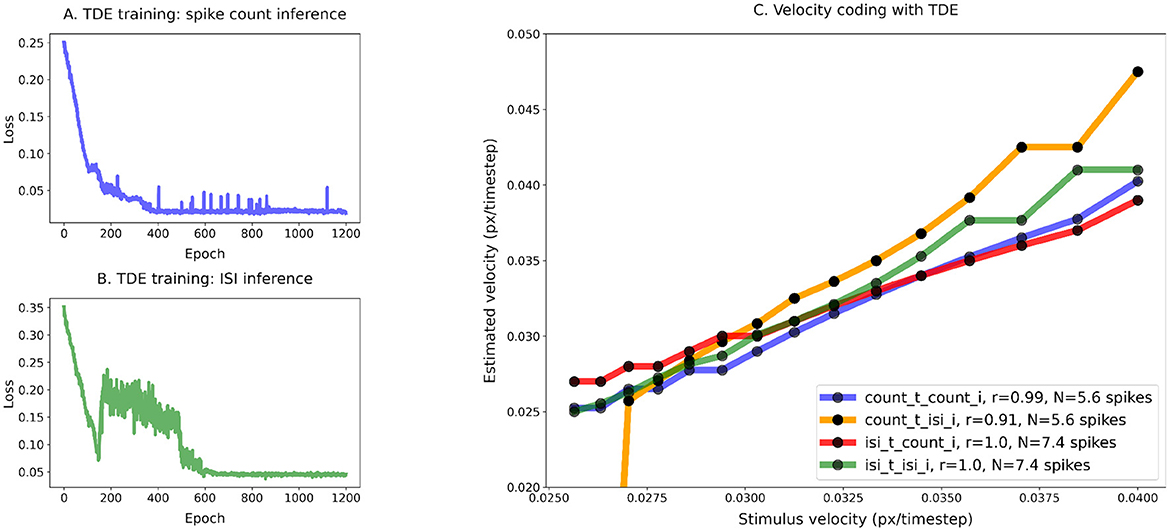 Figure 5 shows that the TDE can be trained to encode a wide dynamic range of input velocities. The loss function on panels A (training with the spike count) and B (training with ISI) gradually decreases during training, indicating that with both inference methods it is indeed possible to train the TDE to discriminate input velocities in a wide dynamic range.
