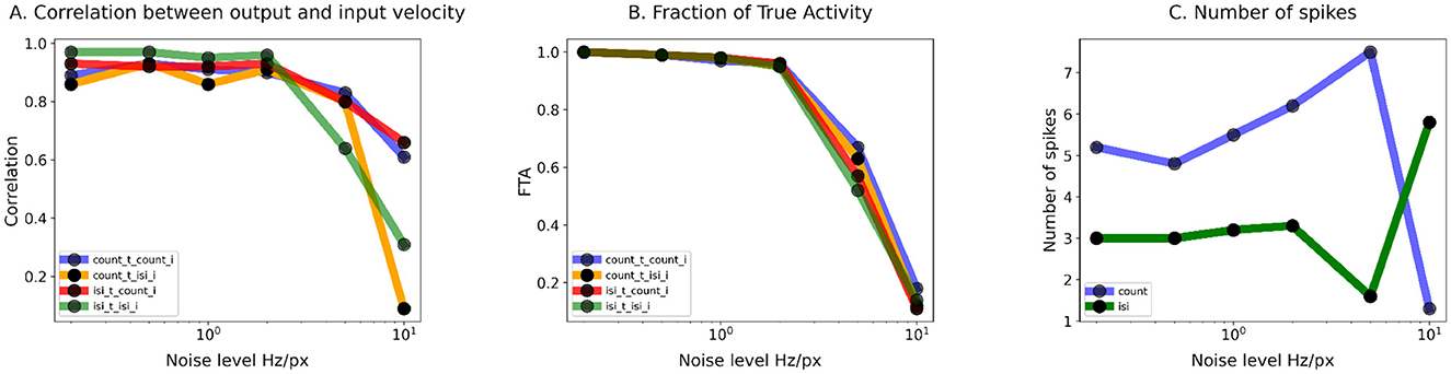 Figure 8. Training of the TDE-3: Summary statistics of TDE performance in the presence of noise. (A) Correlation of the TDE output with ground truth input velocity as a function of noise magnitude. (B) FTA as a function of noise magnitude. (C) Average number of spikes used for encoding of an edge velocity as a function of noise level. In all three cases, noise levels are plotted on the logarithmic scales. For panels A and B the color code is as follows: Blue—training with spike count, inference with spike count during the test; Orange—training with spike count, inference with ISI during the test; Green—training with ISI, inference with ISI during the test; Red—training with ISI, inference with spike count during the test. For (C) blue describes training with spike count, green—training with ISI.