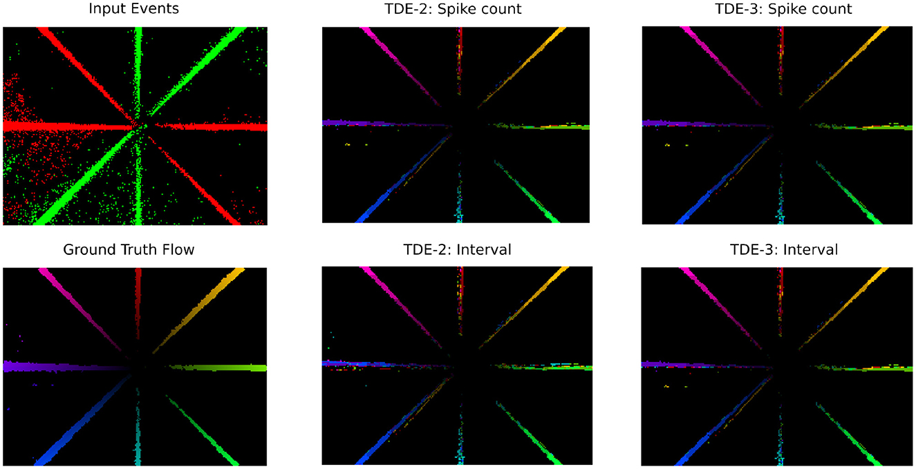 Figure 11 employs a color code scheme from Figure 14 to visualize the optical flow coding of various TDE networks to compare with ground truth (Figure 11 left bottom). The figure indicates that in all 4 testing conditions, there is a close correspondence between TDE inference and ground truth. This observation is also supported quantitatively. In all four cases, TDE showed similar [and fairly low, see Rueckauer and Delbruck (2016)] AAE (mean and std of ≈ 20°, Table 4) and relative average endpoint error (rAEE, mean of ≈ 0.4, std of ≈ 0.2).