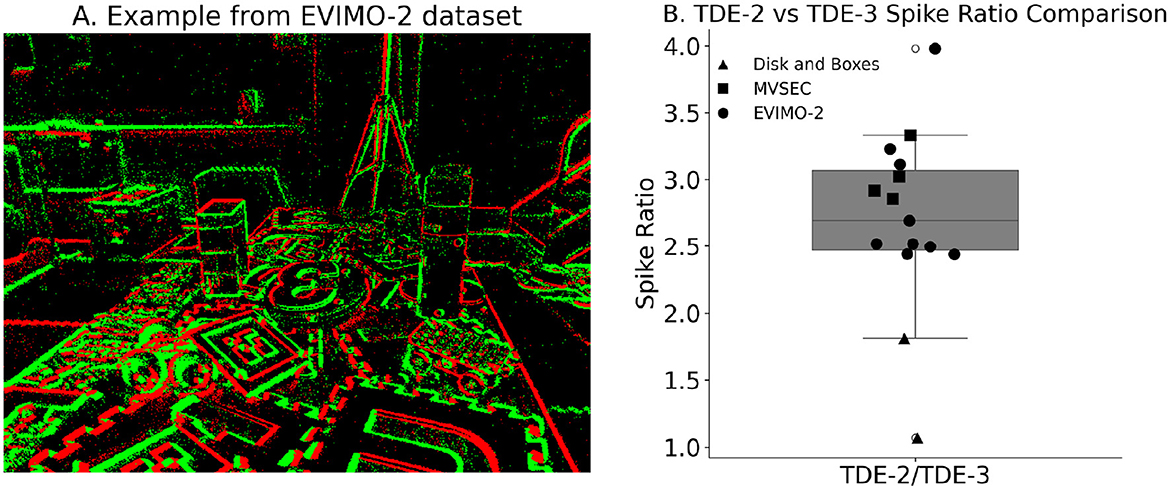 Figure 12. Circuitry energy efficiency. (A) Example of the EVIMO-2 dataset. On events—green, Off events—red. (B) Ratio of the spikes emitted by TDE-2 and TDE-3 based networks for the three datasets: triangles—disk and boxes from Rueckauer and Delbruck (2016); squares—MVSEC driving sequences; circles—EVIMO-2.