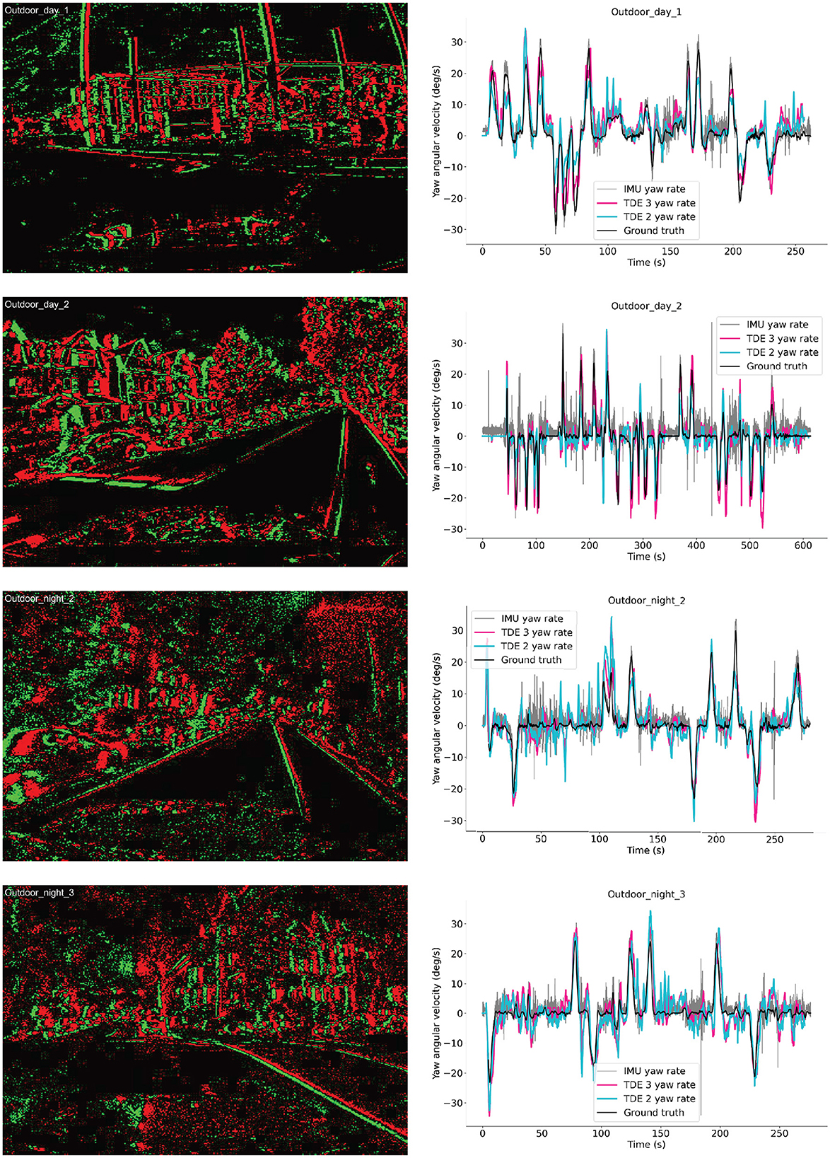 Figure 13. Ego-motion estimation from MVSEC dataset. Left column: examples of the event-based input. Green—On events, Red- Off events. Right column: yaw angular velocities as functions of time for four testing sequences. Black—ground truth angular velocity, Gray—IMU data, Cyan—TDE-2, Deeppink—TDE-3.