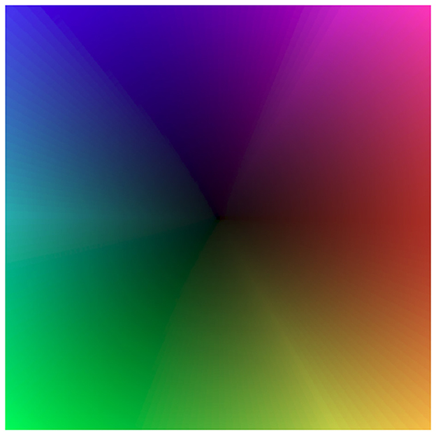 Figure 14. Color map employed for the visualization of the optical flow. Direction is encoded with hue, magnitude with brightness.