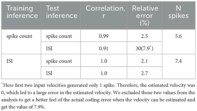 For this experiment, fine resolution was paramount. Therefore, we calculated mean relative error by dividing the difference between true and inferred velocity by true velocity and averaging this metric across all velocities (see Equation 5, Table 1). Unsurprisingly, ISI evaluation with spike count training yielded the largest relative error (30%). Even when excluding the first two velocities, which, because TDE emitted only 1 spike, contributed to the variance the most, the relative error remains >= 3 times higher (7.9%) than for the other three conditions, where velocity was encoded with an error as small as 2.1% (ISI training, spike count evaluation, red line). We also note in this experiment that training with ISI led to a higher average number of spikes (7.4) compared to spike count training (5.6) (see Table 1).