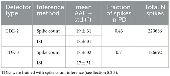 To promote linear mapping between the input velocities in PD and the TDE outputs, we performed supervised training with BPTT and surrogate gradients for both spike count and ISI-based inference methods and compared obtained results (see Section 2 and 5.2 for the details). Note that in the context of linear mapping of input velocities into TDE outputs, the TDE-2 and TDE-3 are identical because the delay between the activation of the facilitator and trigger is not affected by the inhibitory input. Therefore, although in experiments with synthetic data we perform all of the training on the TDE-3, the results are generalizable to the TDE-2.