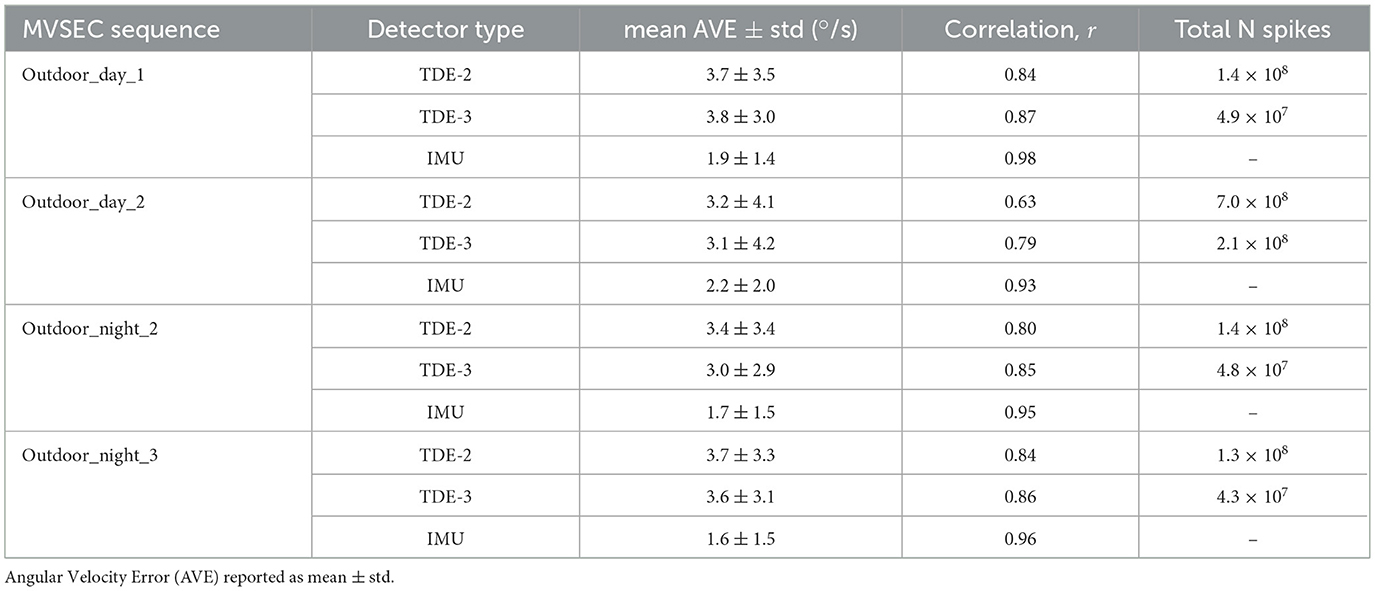 To quantitatively assess performance of the TDE-based networks we calculated errors in the angular velocity estimation (Angular Velocity Error, AVE) and correlation with the ground truth angular velocity for TDE-based networks and IMU. We also calculated number of spikes emitted by TDE-2 and TDE-3 based networks (Table 5). To compare our results with other approaches to ego-motion estimation from MVSEC event-based visual input (Greatorex et al., 2025; Zhu et al., 2019; Mitrokhin et al., 2019a; Ye et al., 2020) we also estimated Average Relative Rotation Error (ARRE, see Methods for the details, Table 6).