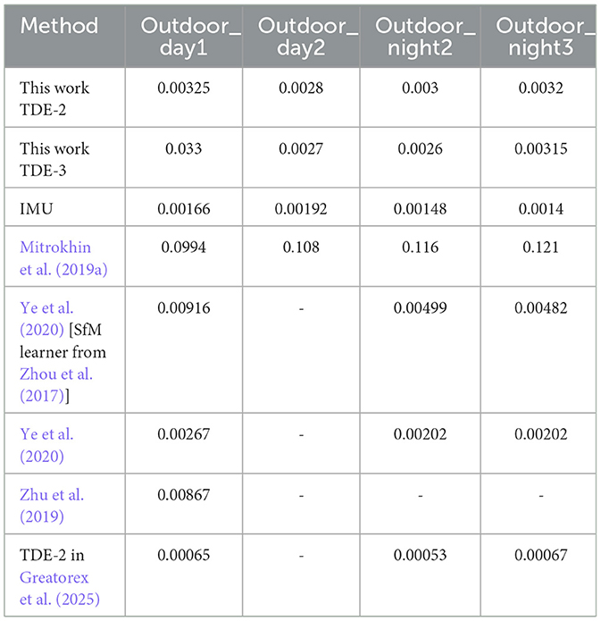 The results show that our algorithms based on TDE-2 / TDE-3 perform on par with neuronal networks containing 1.5 × 105 trainable parameters (Mitrokhin et al., 2019a). Caution, however, should be applied in interpreting these results. In most of the other approaches (Zhu et al., 2019; Mitrokhin et al., 2019a; Ye et al., 2020) networks estimated pitch, roll, and yaw angles, whereas we estimate only the yaw angle. Although driving cars indeed mainly rotate along the yaw axis, ground truth data show small [≈10 times smaller than yaw rotations Zhu et al. (2018a)] but non-zero pitch and roll angular velocities. Furthermore, in our study, we recovered the absolute scale by normalization, while (Zhu et al., 2019; Mitrokhin et al., 2019a; Ye et al., 2020) had to learn it from the data.