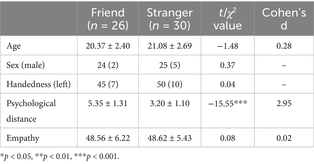 G*Power (Faul et al., 2007) was used to calculate the required sample size with f = 0.25, α = 0.01, power = 0.95, which indicated that 54 pairs were needed. A total of 65 pairs (130 participants) were recruited from Yunnan Normal University. However, nine pairs were excluded due to excessive bad channels (>4 channels, 10% of all channels), failure to comprehend the instructions, and inability to complete the experiment. The final sample consisted of 56 pairs for the next data analysis. According to their self-reports about psychological distance (Aron et al., 2004), pairs with scores above the mean of all pairs (4.196) were classified as the friend group (26 pairs, including 24 female–female pairs), whereas dyads with scores below the mean were classified as the stranger group (30 pairs, including 25 female–female pairs). In addition, the two groups showed a significant difference in psychological distance and no significant difference in empathy (Table 1).