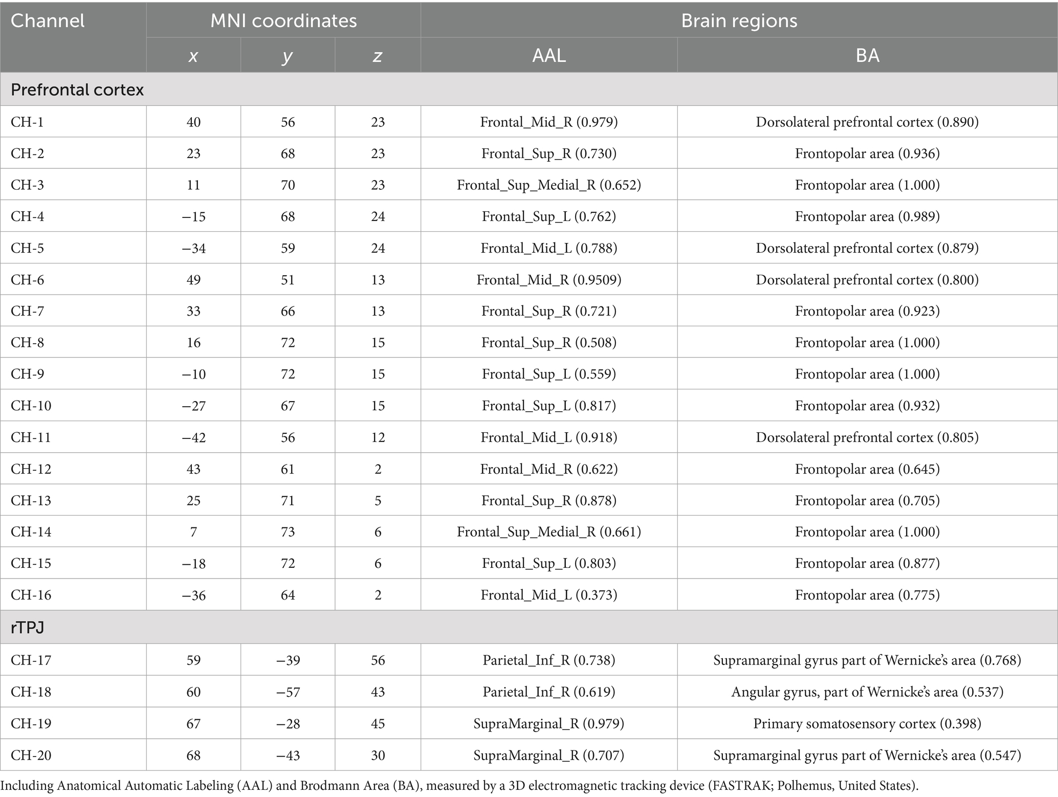 The fNIRS signals of both paired members were recorded from the same 20 channels using an fNIRS system (LABNIRS, Shimadzu Co., Japan) at a sampling rate of 11.90 Hz. For each participant, two sets of optode probes covered two respective brain regions: the PFC was monitored with four emitters and four detectors, constituting 16 channels (denoted by “CH” and a number below); the rTPJ was monitored with two emitters and two detectors, forming four channels, following the international 10–20 system (see Figure 1B). The distance between the adjacent emitters and detectors was ∼3 cm, and the absorption of near-infrared light (wavelengths: 760, 803, and 850 nm). The precise positions of the fNIRS channels were measured by a 3D electromagnetic tracking device (FASTRAK; Polhemus, United States) and registered on the Montreal neurological Institute (MNI) brain space using a virtual registration method (see Table 2).