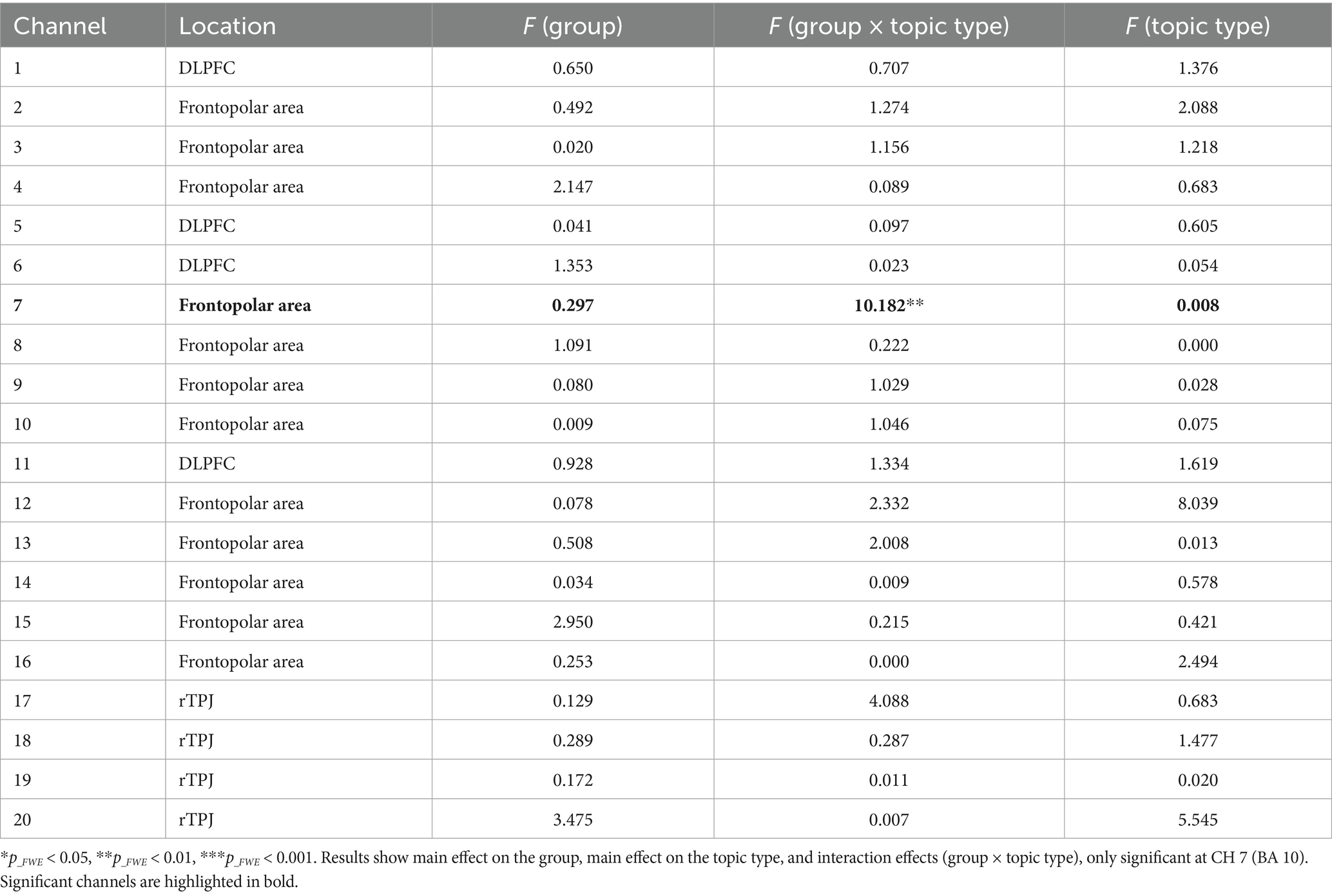 Citation: Tao Y, Zhou M, Wang J, Li X and Ma X (2025) The influence of psychological distance and topic type on inter-brain synchronization of emotion perception during face-to-face communication: an fNIRS hyperscanning study. Front. Neurosci. 19:1670193. doi: 10.3389/fnins.2025.1670193