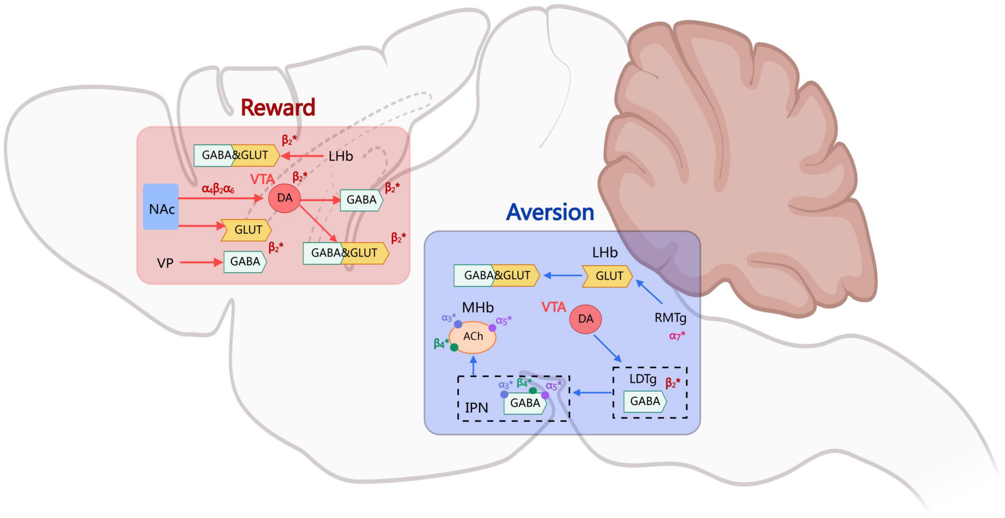 • The VTA-NAc pathway is recognized for its dopaminergic mechanisms underlying rewards, whereas the MHb-IPN circuit is implicated in nicotine aversion through glutamatergic and GABAergic signaling.