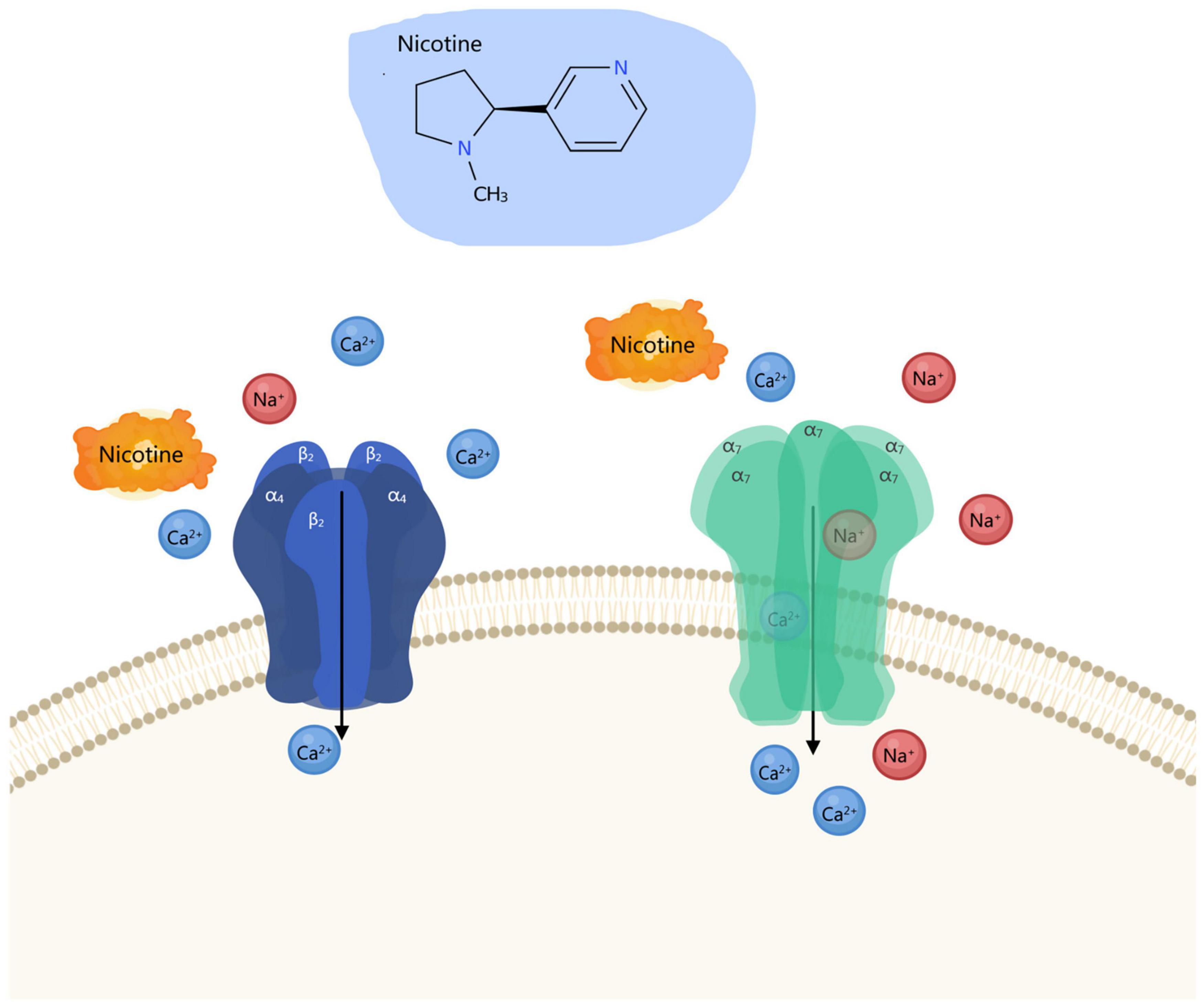 In conclusion, the molecular structure, diverse combinations, widespread distribution, and functional variety of nAChRs collectively underpin their central role in nicotine addiction (Table 1).